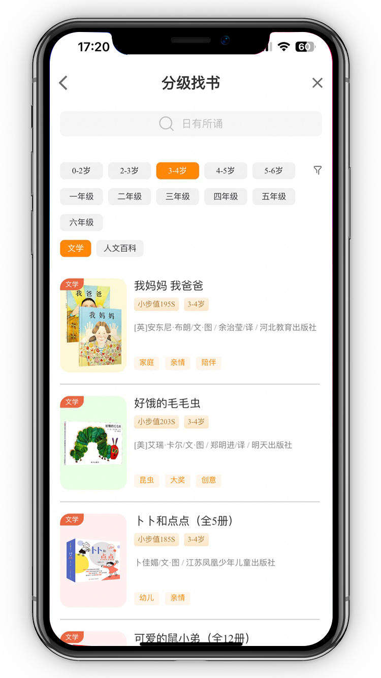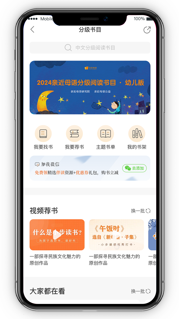 ◆ 找书功能: 您可以获得2024年最新版分级阅读书目,也可进入亲近母语书库,浏览和检索书籍信息;