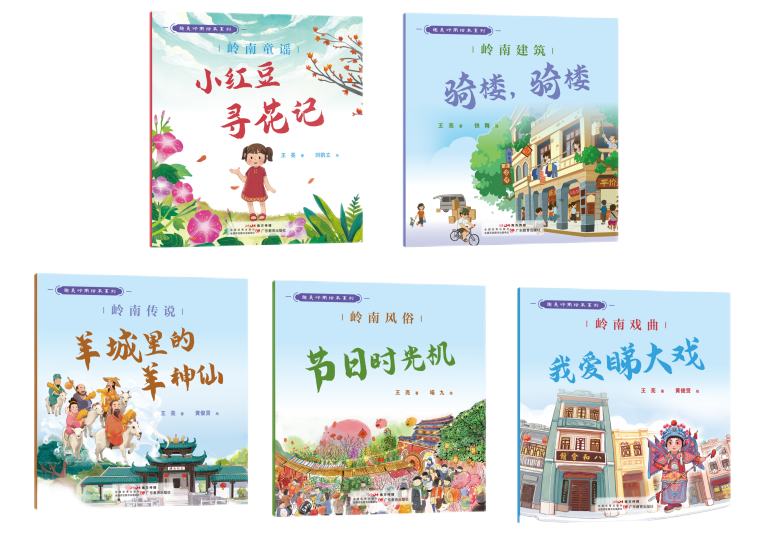 《趣美岭南》绘本系列专为 3 至 8 岁儿童设计,分为《羊城里的羊神仙》《节日时光机》《骑楼,骑楼》《小红豆寻花记》《我爱睇大戏》五册,全方位展现岭南的传说、节日、建筑、童谣与戏曲。