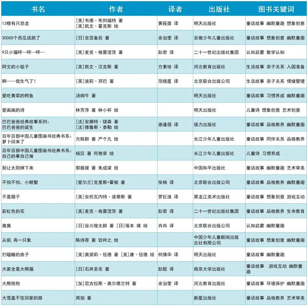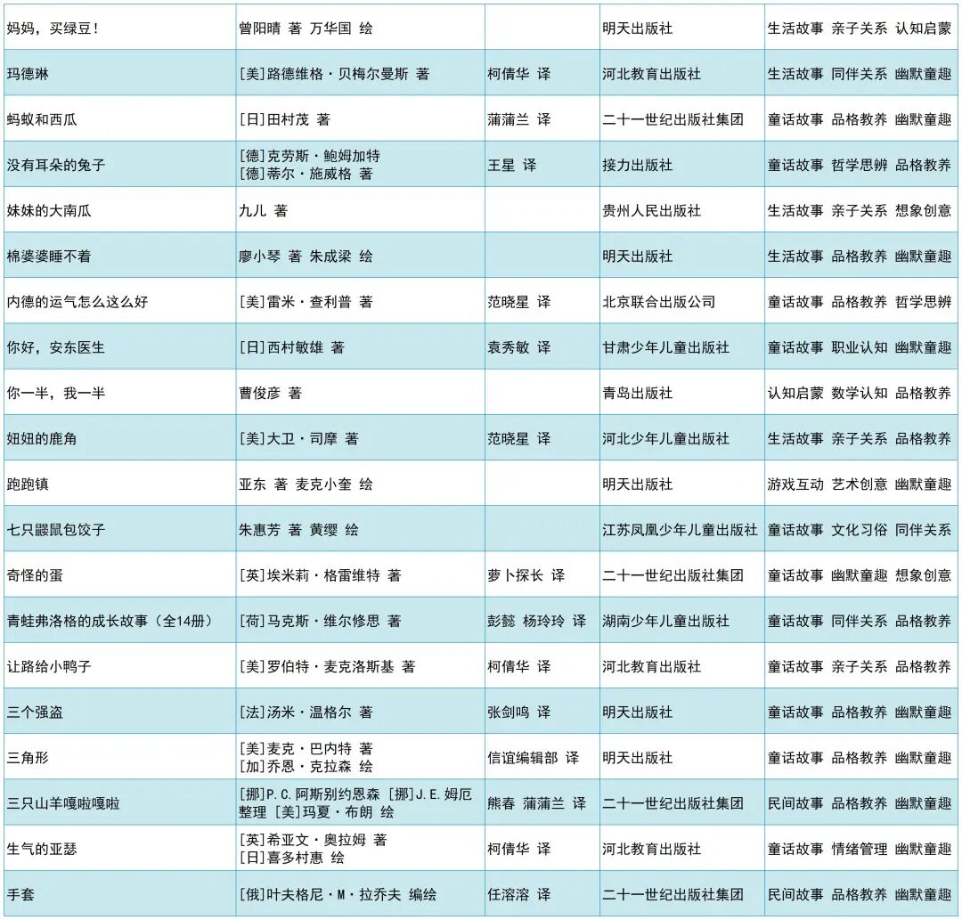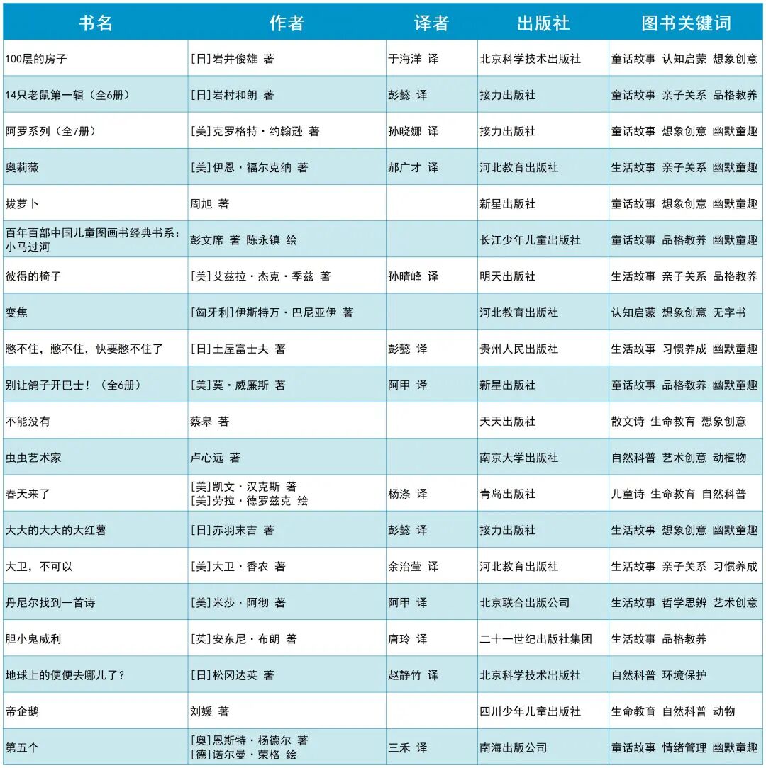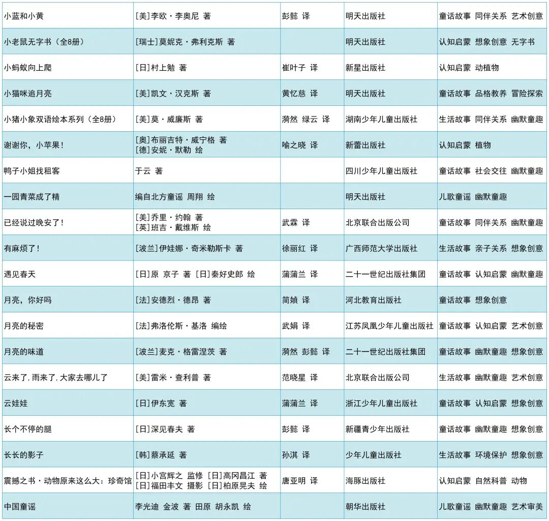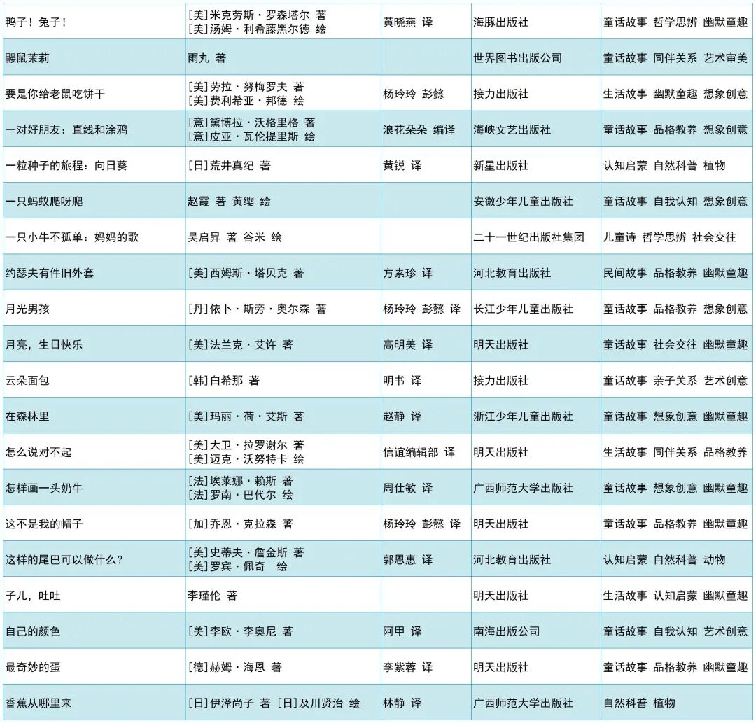 书目总量保持1000册,在保留历久弥新的经典作品同时,持续增补近两年出版的优秀新书。内容全面覆盖儿童社会性、认知、语言、艺术审美、思维与想象力等发展需求。