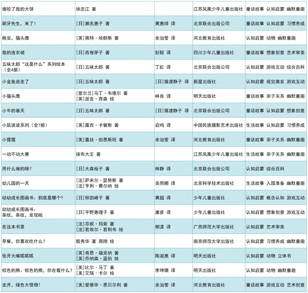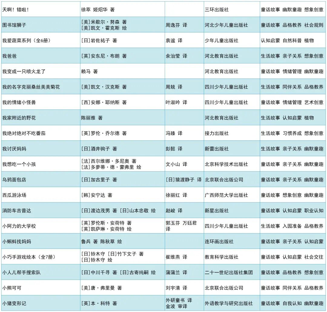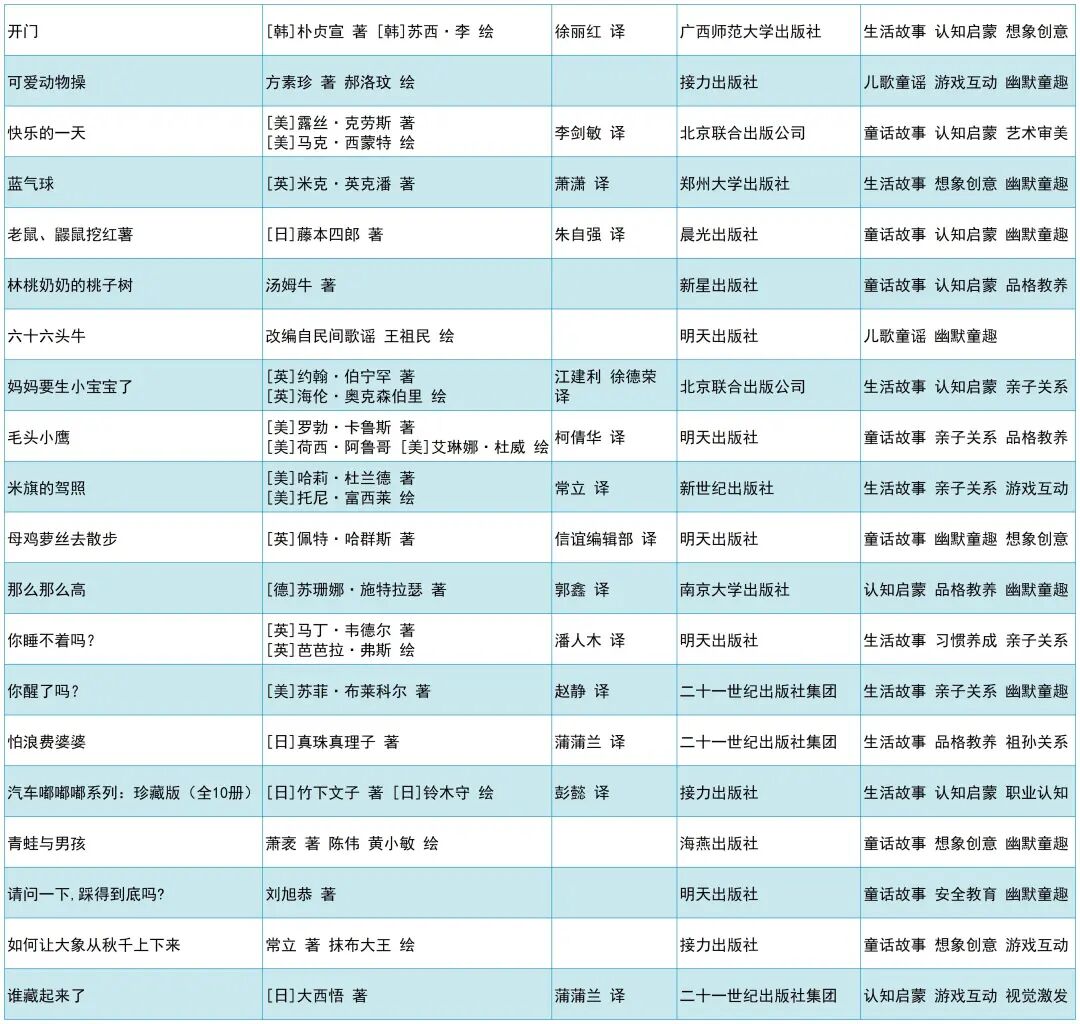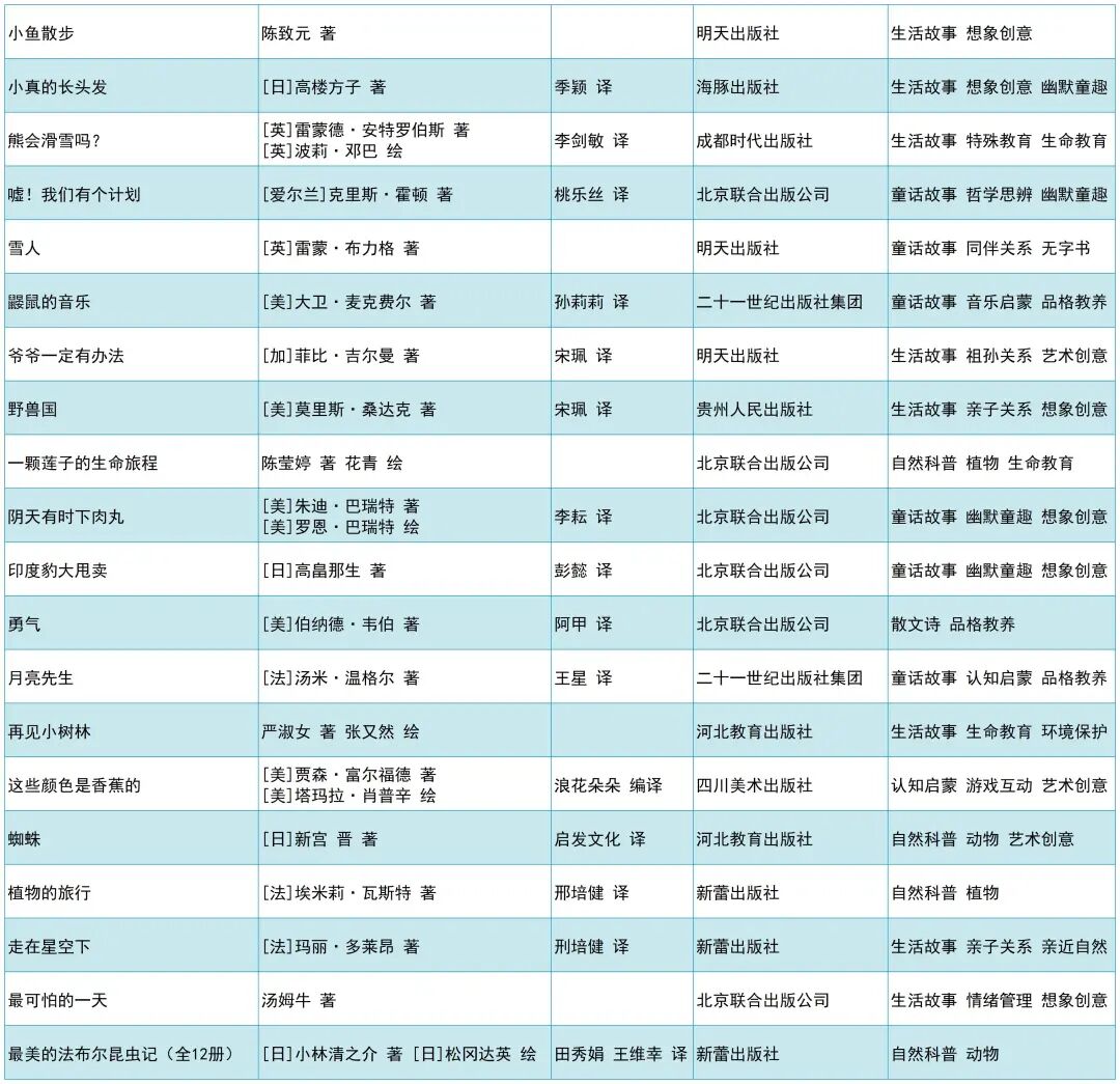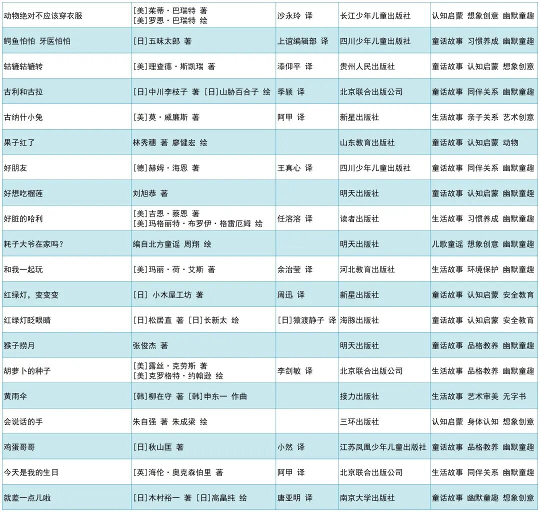 书目总量保持1000册,在保留历久弥新的经典作品同时,持续增补近两年出版的优秀新书。内容全面覆盖儿童社会性、认知、语言、艺术审美、思维与想象力等发展需求。