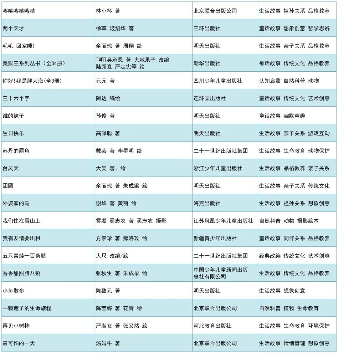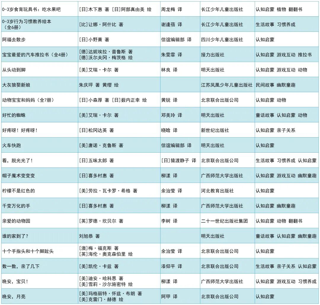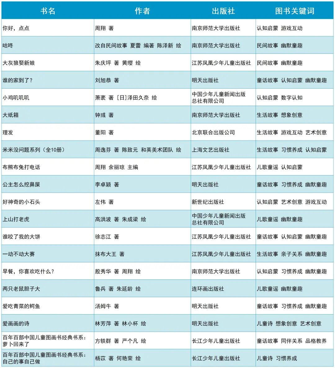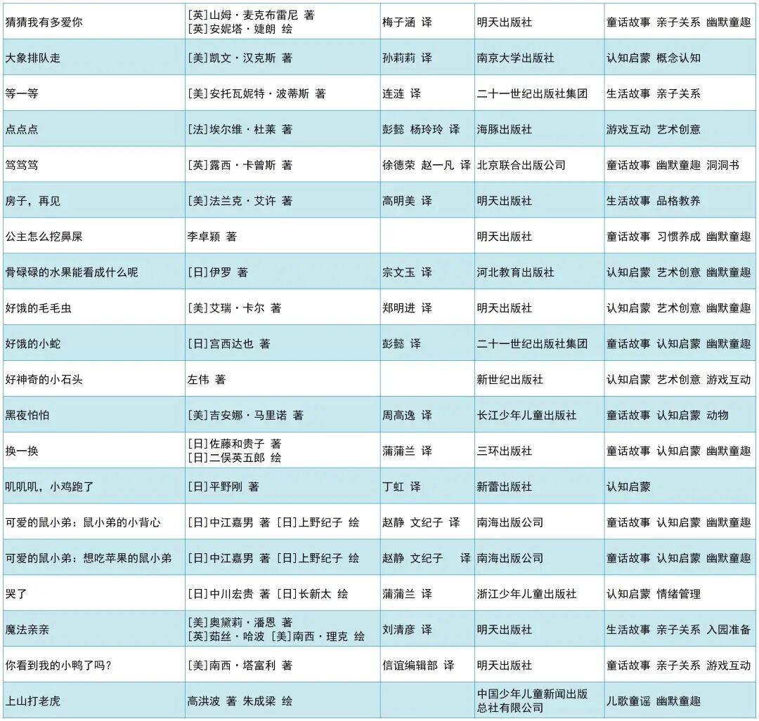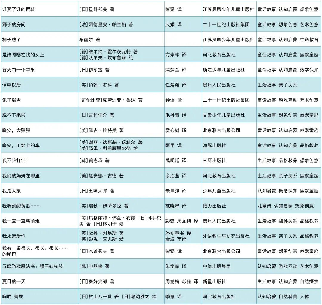 书目总量保持1000册,在保留历久弥新的经典作品同时,持续增补近两年出版的优秀新书。内容全面覆盖儿童社会性、认知、语言、艺术审美、思维与想象力等发展需求。