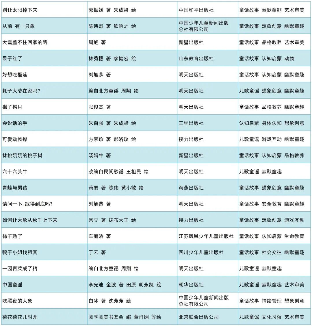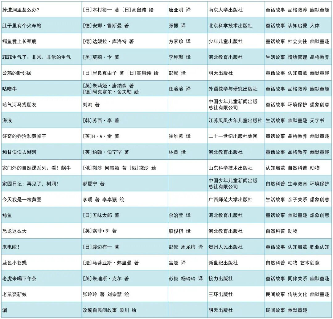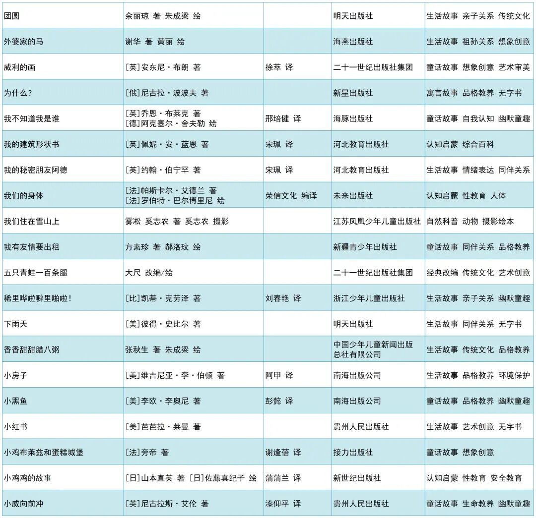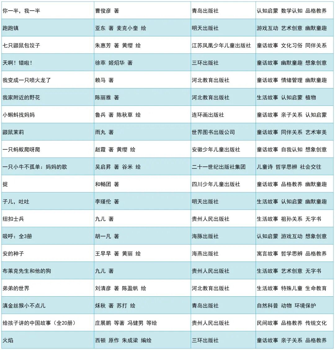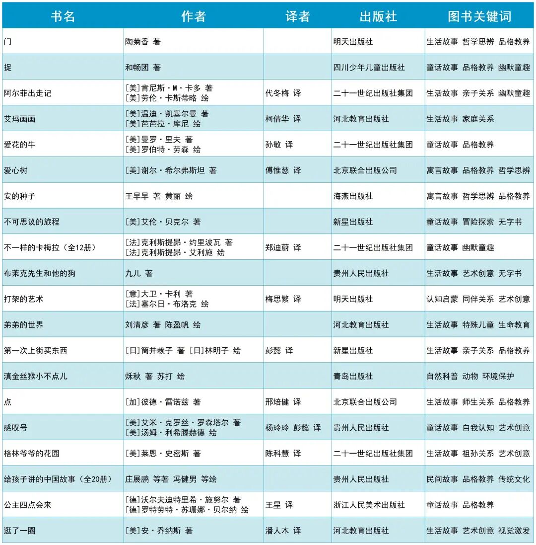 书目总量保持1000册,在保留历久弥新的经典作品同时,持续增补近两年出版的优秀新书。内容全面覆盖儿童社会性、认知、语言、艺术审美、思维与想象力等发展需求。