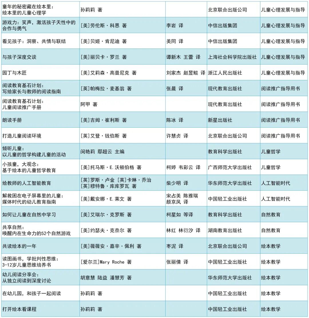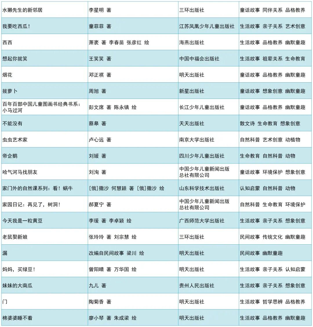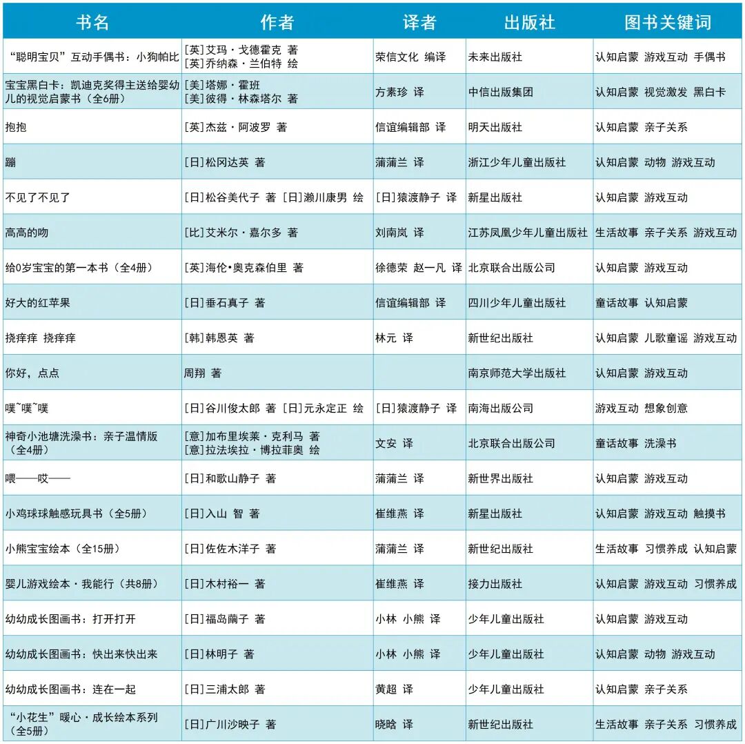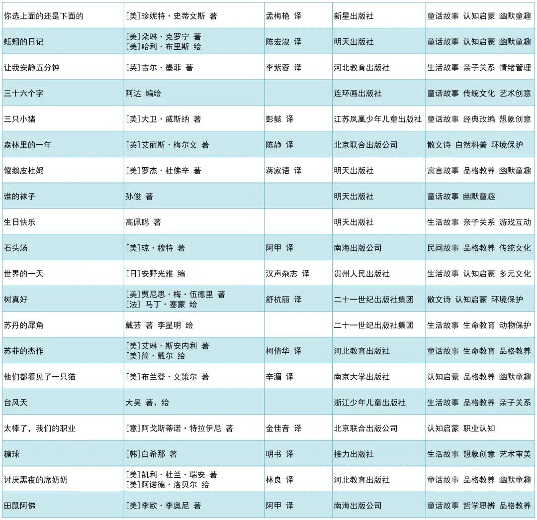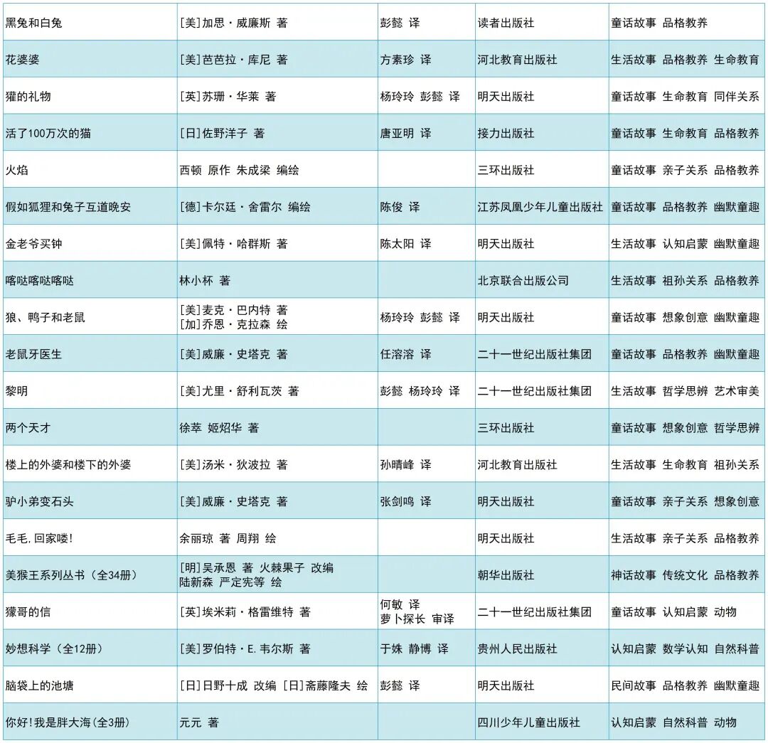 书目总量保持1000册,在保留历久弥新的经典作品同时,持续增补近两年出版的优秀新书。内容全面覆盖儿童社会性、认知、语言、艺术审美、思维与想象力等发展需求。