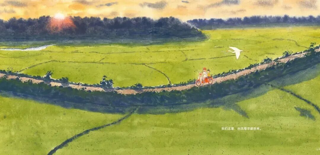 这本书以自然与人文为主题。但它不“讲述”主题。它只是呈现一个孩子的视角:有爸爸身为一家之主的努力与辛劳,有孩子以自己的方式为家人提供的小小帮助,还有村民面对农田被淹后的无奈与淡然,以及台风带来的“惊喜”——一只不知从哪里掉落的白色幼鸟。