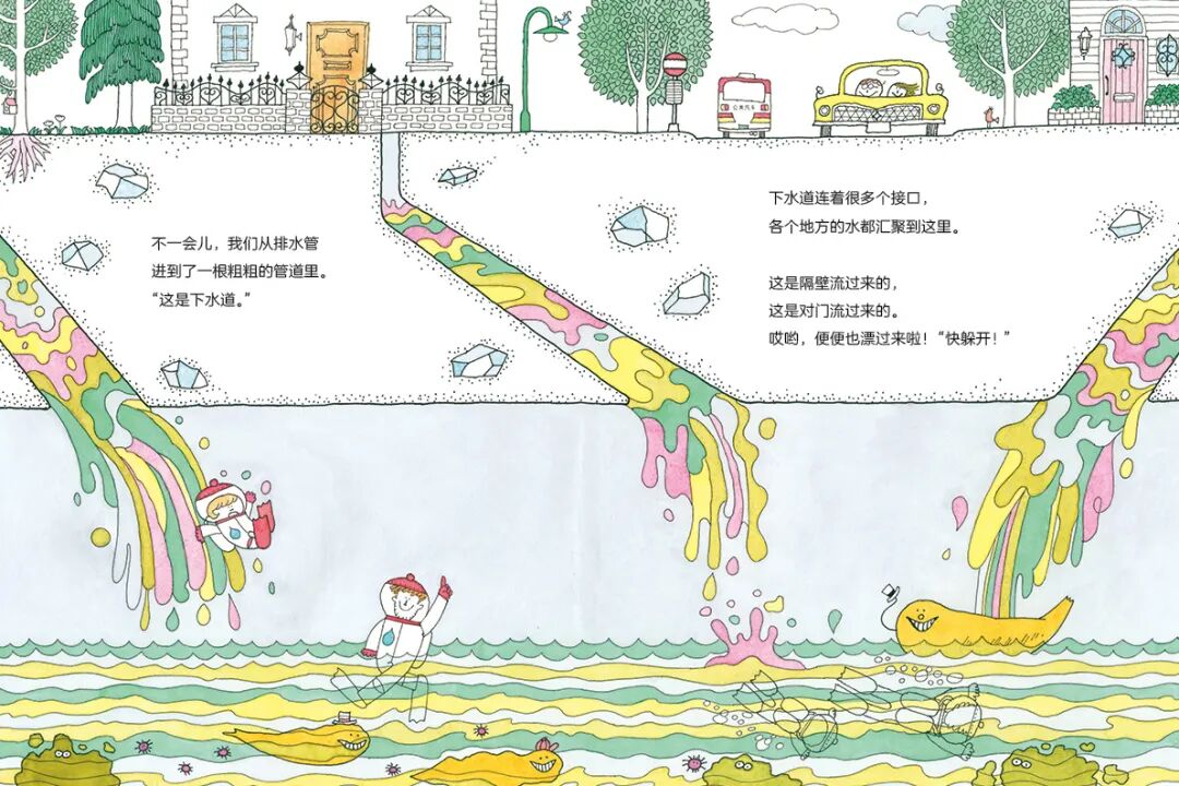 这是一本将科普知识与想象力结合、讲述城市地下排水系统的绘本。不论是马路上的下水井盖、马桶的下水管道,还是生活中我们使用的水,都被排去了我们看不见的地方。小男孩很好奇自己的尿啊、便便啊、洗澡水啊,都哪里去了。男孩的爸爸拿出变小药水,父子二人穿上潜水装备,喝下变小药水,进入了平时我们根本没有机会看到的城市排水系统的内部……