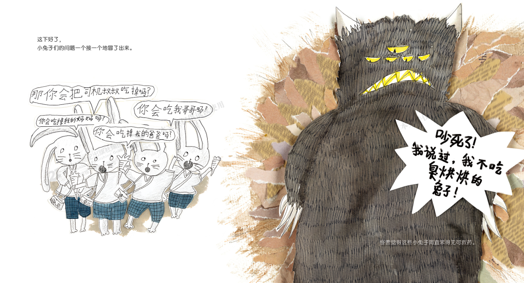 这是一本充满反转的原创故事绘本。小兔子们坐校车去郊游,准备出发的时候,一头可怕的怪兽跳上了校车。怪兽嚷着要去恶魔谷,虽然他说自己不吃臭烘烘的小兔子,但小兔子们还是很害怕。不过,恐惧也不能阻止小兔子们问问题,他们问怪兽会不会吃了自己、睡前会不会刷牙、喜不喜欢吃胡萝卜……就在怪兽要被问题淹没的时候,来了一只更大的怪兽——原来那只要去恶魔谷的是一只小怪兽,他不想上学,想去郊游,被妈妈抓到后,大吵大嚷的样子和不想上学的小孩子没什么两样。
