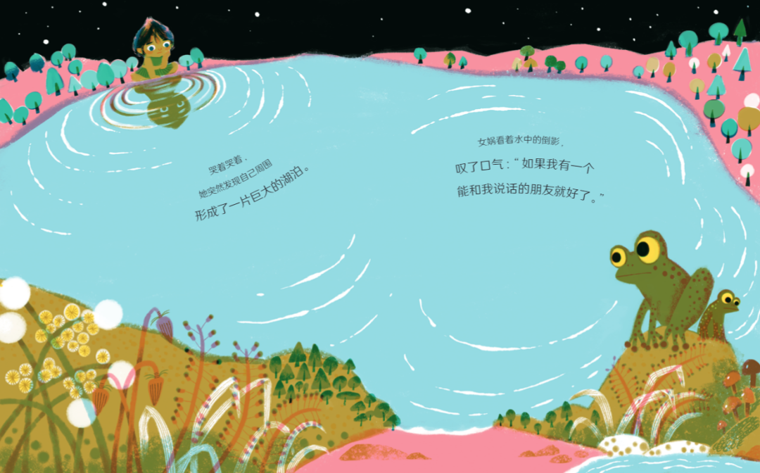 王赓玉 著,枣泥 译,中信·红披风出品,中信出版集团,2023年9月。适读年龄:3+ 这是一本重新演绎中国传统民间神话的绘本。很久以前,天地间只有女娲一个人,虽然有鸟兽作伴,小女娲还是觉得很孤单。每天,她都向小鸟、树木、天空、大地问好,它们却都无法用语言回应她。直到有一天,小女娲捏出了一个小泥人,当这个小泥人对她说“你好”的时候,她第一次感受到了友谊……
