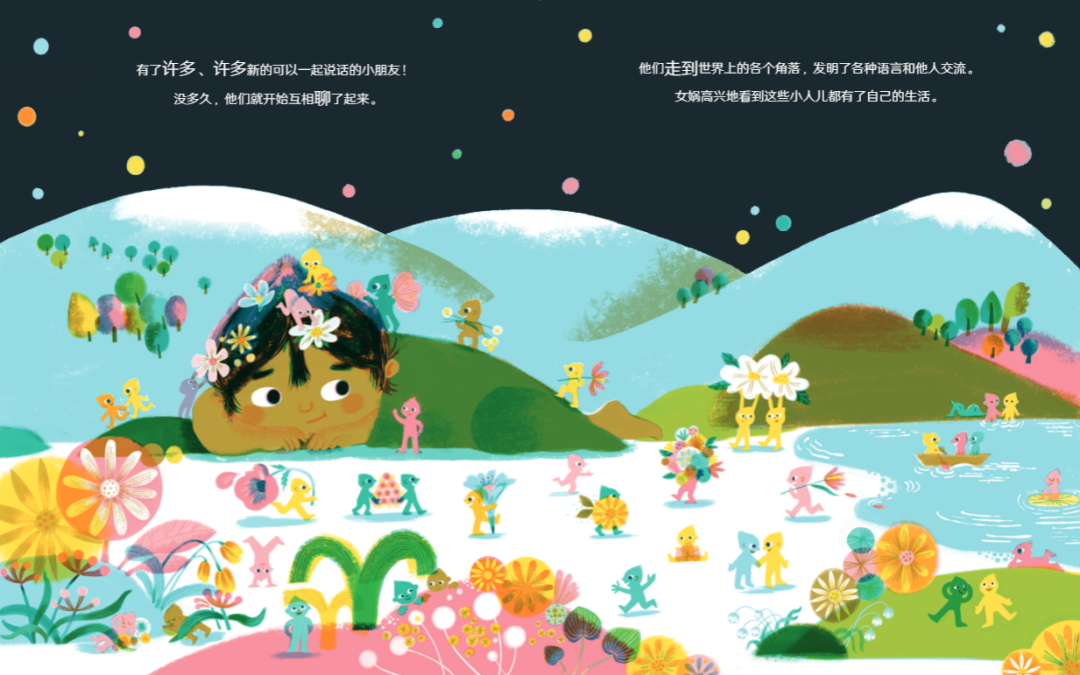 在《小女娲也想有朋友》中,拥有共通的“语言”被视为建立友谊的重要前提。小女娲希望有人能够和自己说一样的话,希望自己说出口的话能够被回应。而在书的最后,小泥人们在大地上生活,他们纷纷说出“你好”,用我们这个世界上不同的语言。