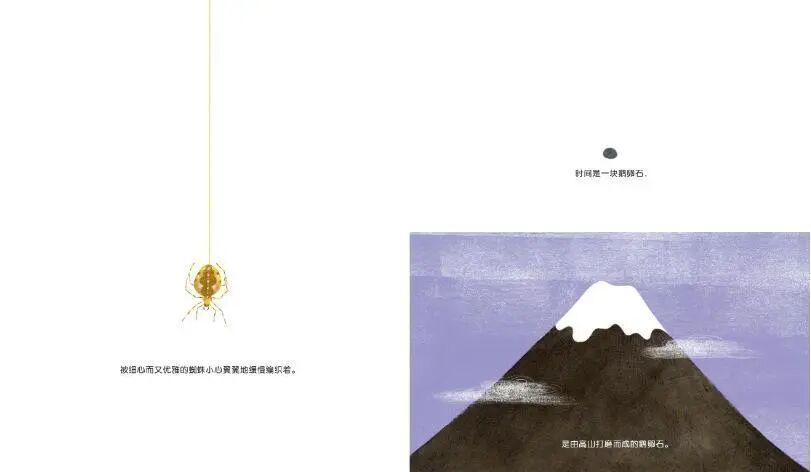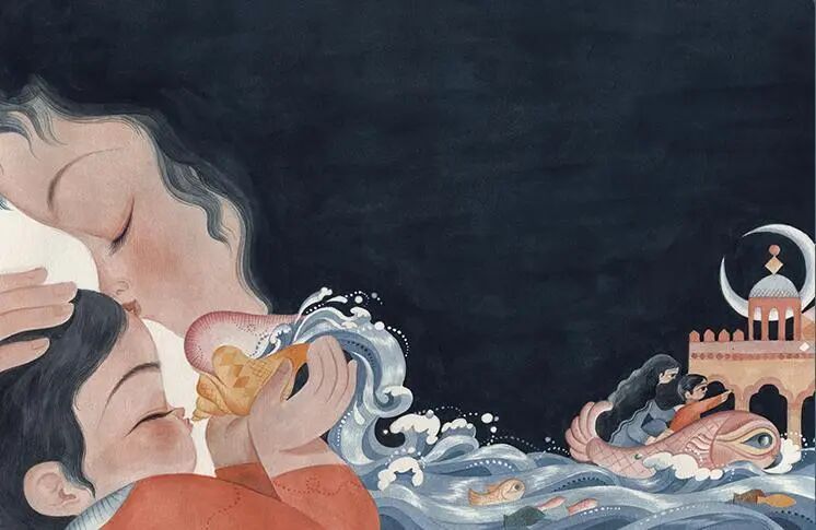 《云与波》选自诗人泰戈尔的散文诗集《新月集》,这是一首清新自然、充满童趣、表达亲情的诗歌,讲述了孩子宁愿放弃从白云和波浪中而来的小伙伴的嬉戏和玩乐的召唤,而选择回到家,与母亲一起游戏,一起度过美好时光的爱的故事。这首诗用一问一答的诗歌语言,塑造了一个天真活泼的孩子形象,郑振铎先生的译文活泼有趣,读起来朗朗上口,而插画师老老老鱼则通过充满想象力和颇具异域风情的插画,将孩子对母亲真挚的爱表达得淋漓尽致。