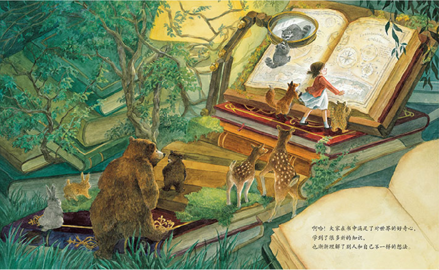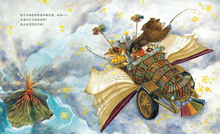 这是一个充满脑洞和想象力的故事。在书中你可以去所有想去的地方,去熊熊燃烧的火山探险,到云朵里钓星星;书中还藏有许多有趣的细节,等待你去发现,各种各样的书、各种小动物读书的场景,认真找找看~