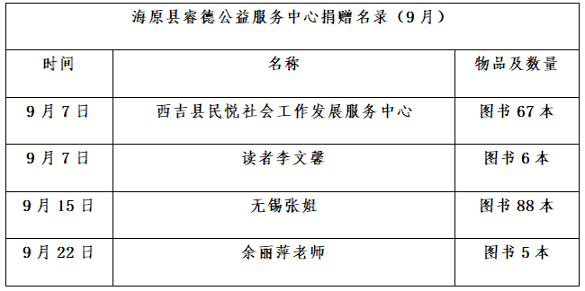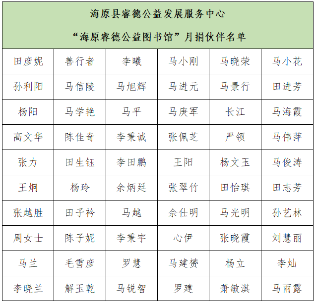 表2:海原县睿德公益服务中心“海原睿德公益图书馆”项目月捐名单
