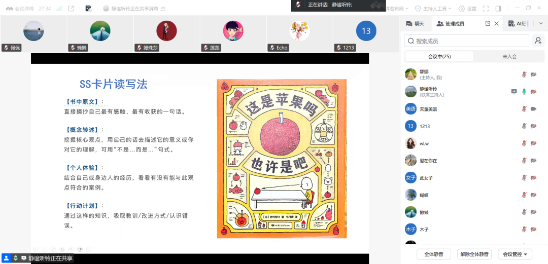 主题:借“绘本”听见的思考的声音,25位合作教师参与,并积极分享自己的思考。