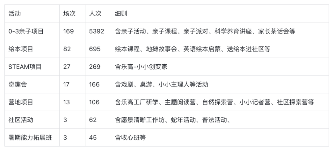 -我们的服务范围除了馆内,还进入了8个村社区、养老院、学校、工厂等,开展了各类营地项目、素养活动、0-3亲子课程、亲子派对等。
