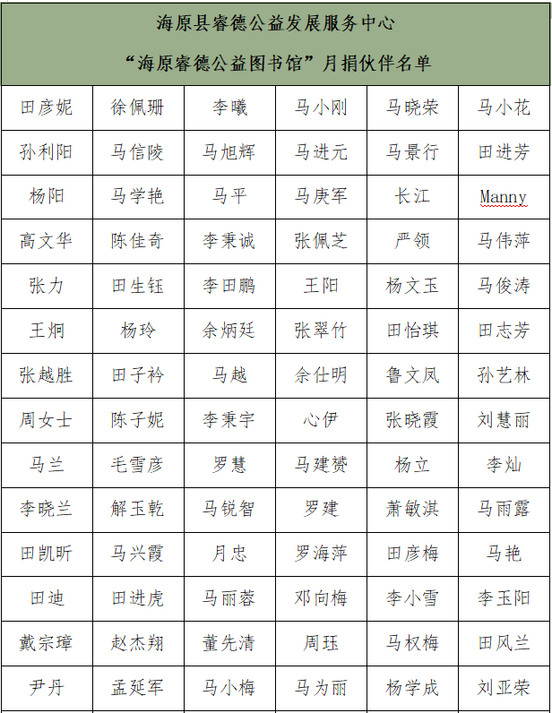 表2:海原县睿德公益服务中心“海原睿德公益图书馆”月捐名单