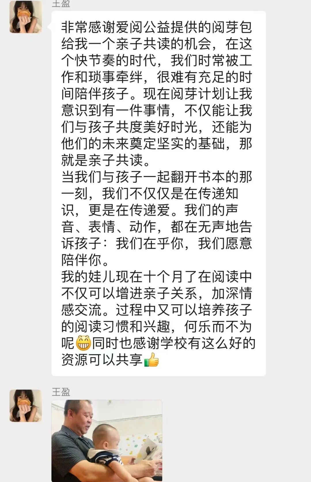 家长领取阅芽包后,有妈妈反馈“爱阅公益提供的阅芽包给我一个亲子共读的机会,在这个快节奏的时代,我们时常被工作和琐事牵绊,很难有充足的时间陪伴孩子。现在阅芽计划让我意识到有一件事情,不仅能让我们与孩子共度美好时光,还能为他们的未来奠定坚实的基础,那就是亲子共读。”