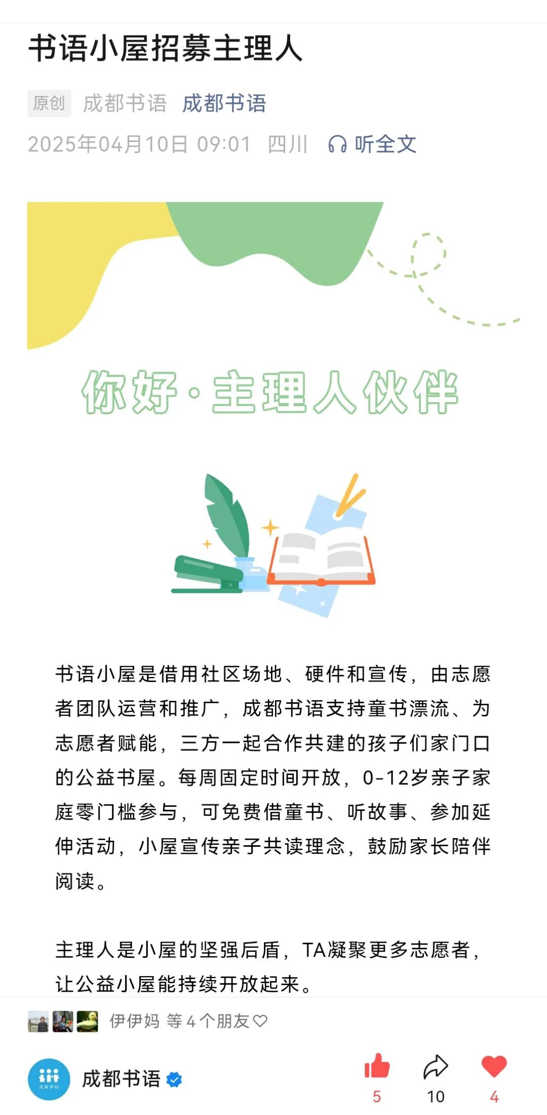 4月25日开展因爱朗读——书语者支持计划.线上陪伴活动,邀请成都书语Yue山小队、成都市武侯区教科院附属小学教师李丽老师,开展”情境读写实践分享“的主题活动分享。