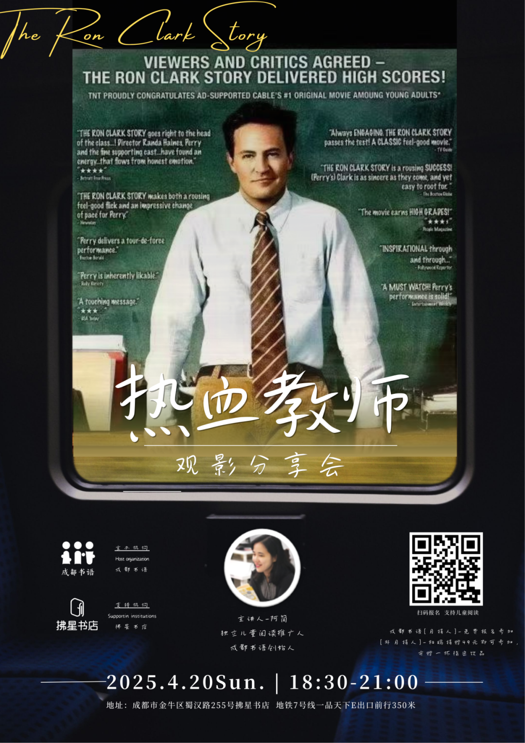 4月20日周日晚,在拂星书店组织了月捐人论影活动《热血教师》。活动当天下午,成都天气骤变突降大雨,20多位月捐人风雨无阻参加了本场论影活动。小伙伴评价我们的选片,认为电影非常值得看。
