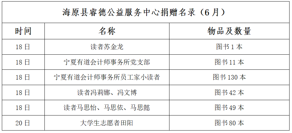 表2:海原县睿德公益服务中心“海原睿德公益图书馆”项目月捐名单