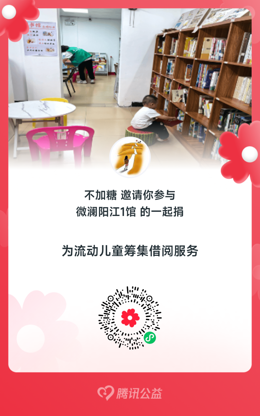 扫码进入腾讯公益,每月持续小额月捐支持友义书房(微澜阳江1馆),助力乡镇阅读推广公益事业。
