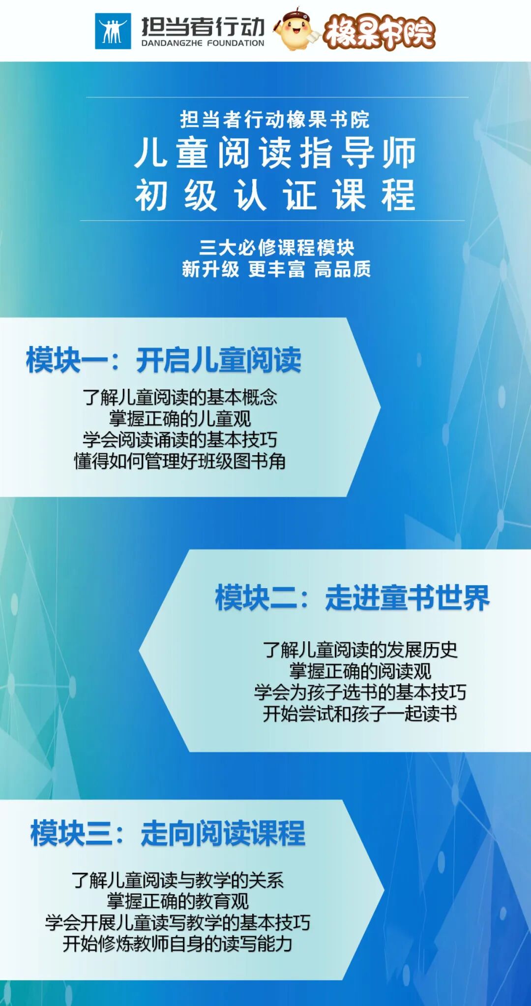 必修课程由橡果书院院长魏智渊老师领衔,担当者行动邀请多位儿童阅读教育领域专家或名师共同研发儿童阅读指导师认证学习课程。