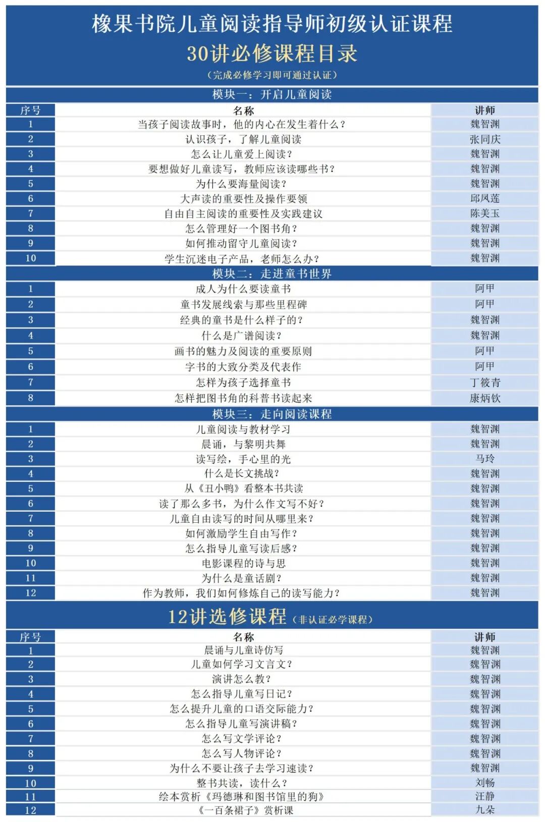 橡果书院儿童阅读指导师初级认证课程分为必修课程和选修课程。