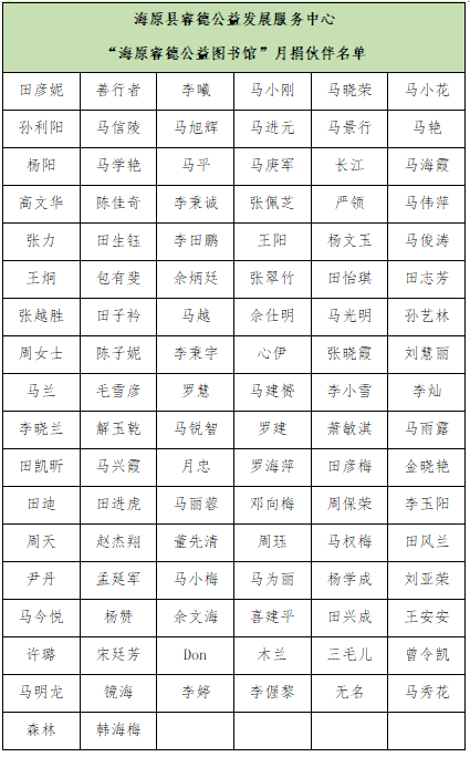 表2:海原县睿德公益服务中心“海原睿德公益图书馆”项目月捐名单