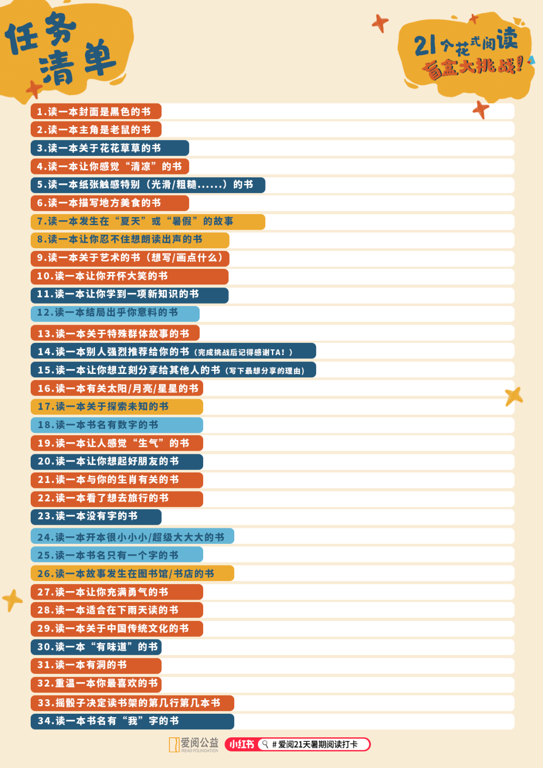 这个暑假,我们准备了一份"夏日阅读降温计划"![21个花式阅读盲盒大挑战],不拼速度、不比厚度,只要好玩!34项挑战内容,你可以随机选取喜欢的任务,再锁定一本对应的书完成阅读,打卡分享“挑战成果”!截至7月底,小红书话题浏览量3.5w+,参与发布笔记2000+,活动仍在持续中。