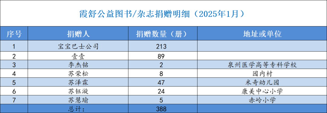 本月收到捐赠图书388本,具体明细如下: