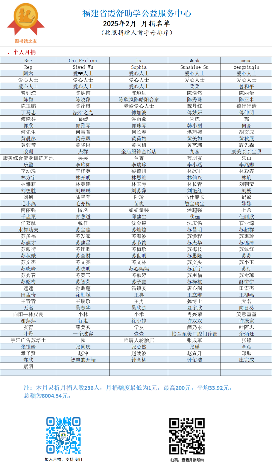 图书馆重在日常的运营,月捐制度是图书馆项目长期可持续运营的重要经费保障。向以下参与霞舒公益月捐计划的伙伴们致谢: