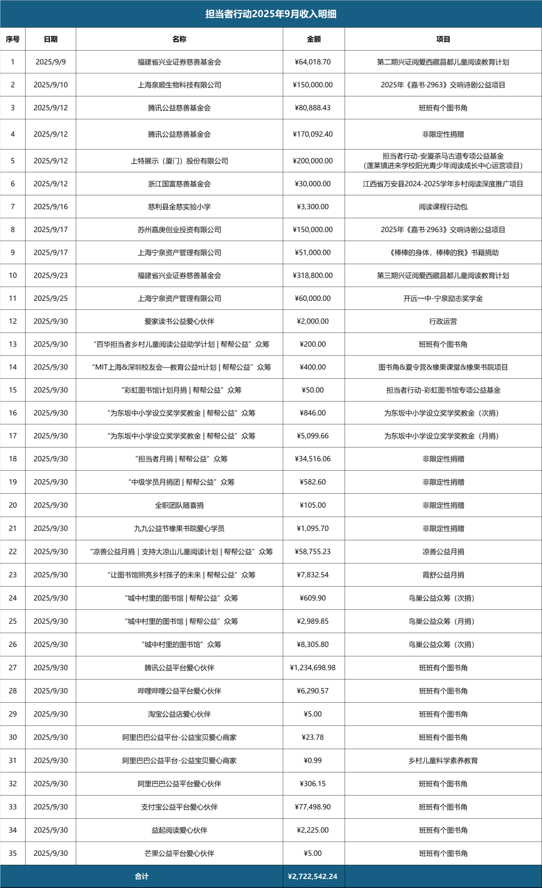 2025年9月,担当者行动共收到社会各界爱心人士捐款及提供服务收入2722542.24元:其中社会组织捐赠收入663799.53元,企业捐赠收入611000.00元,社会公众捐赠收入1444442.71元(其中通过帮帮公益平台-担当者月捐参与月捐计划的人数共计1481人、通过腾讯公益平台-班班有个图书角项目参与月捐计划的人数共计4986人),提供服务收入3300.00元。