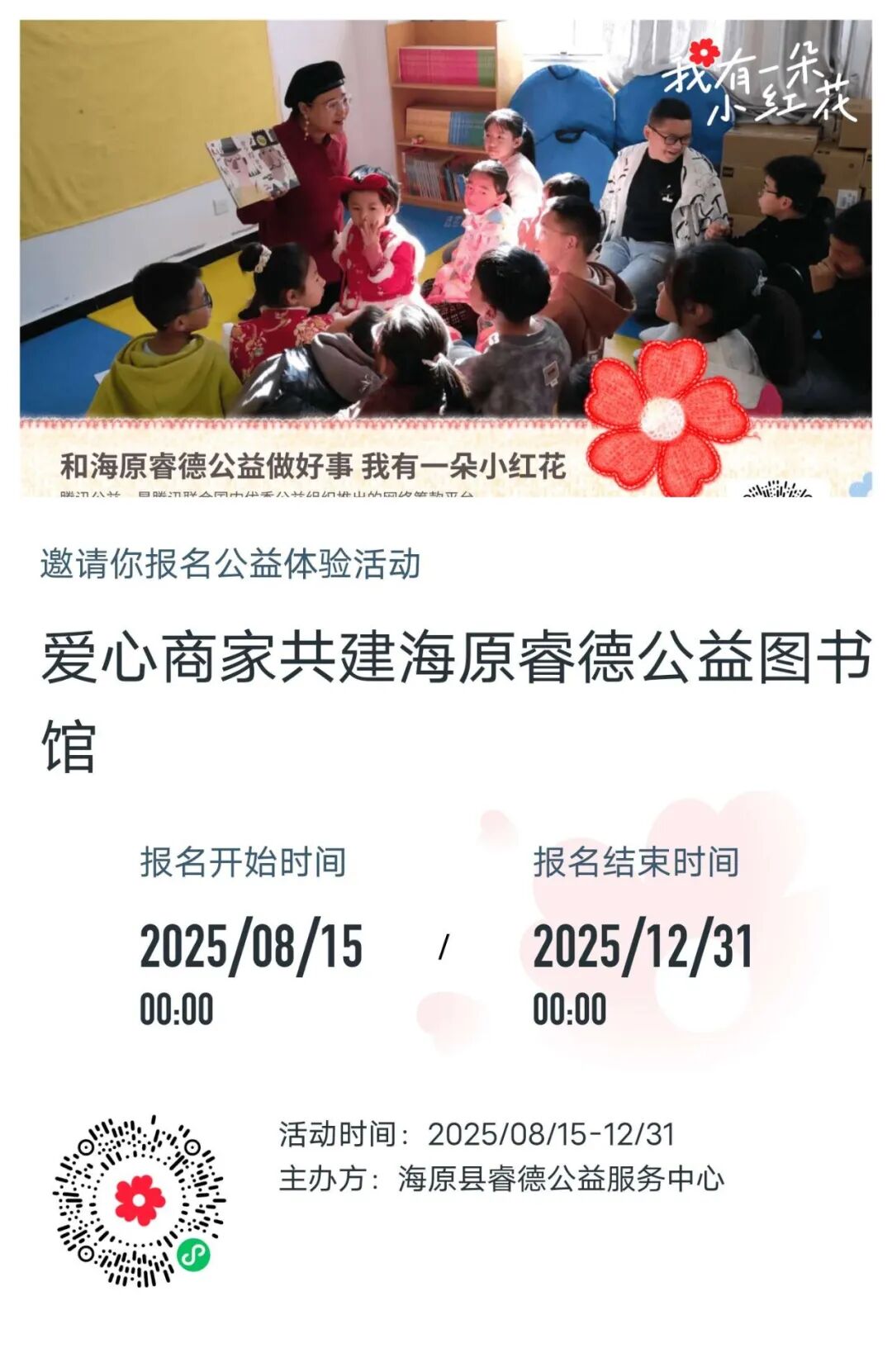 8月15日,海原睿德公益发起“爱心商家共建海原睿德公益图书馆”活动(持续招募中)。