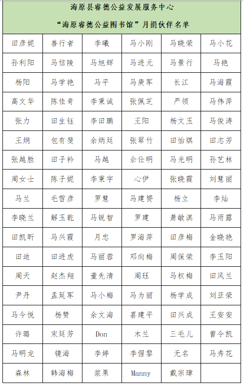 表2:海原县睿德公益服务中心“海原睿德公益图书馆”项目月捐名单