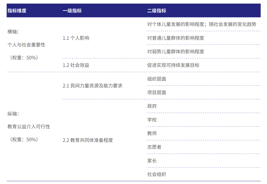 根据14 项议题清单,该模型基于两大维度,横轴表示“个人与社会影响力”(重要性),纵轴表示“教育公益介入可行性”(可行性)。这两个维度各占50%的权重,并进一步细化为4个一级指标和22个二级指标,以评估各教育领域的重要性和可行性。