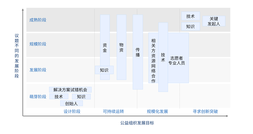 在纵轴(可行性)方面,一级指标包括民间资源资源及能力要求和教育共同体准备程度。民间资源资源及能力要求考虑了民间力量在组织层面和项目层面的能力和资源情况。教育共同体准备程度考虑了政府政策、一线工作者(如教师、学校、志愿者)、家长、社会组织等利益相关方的参与情况