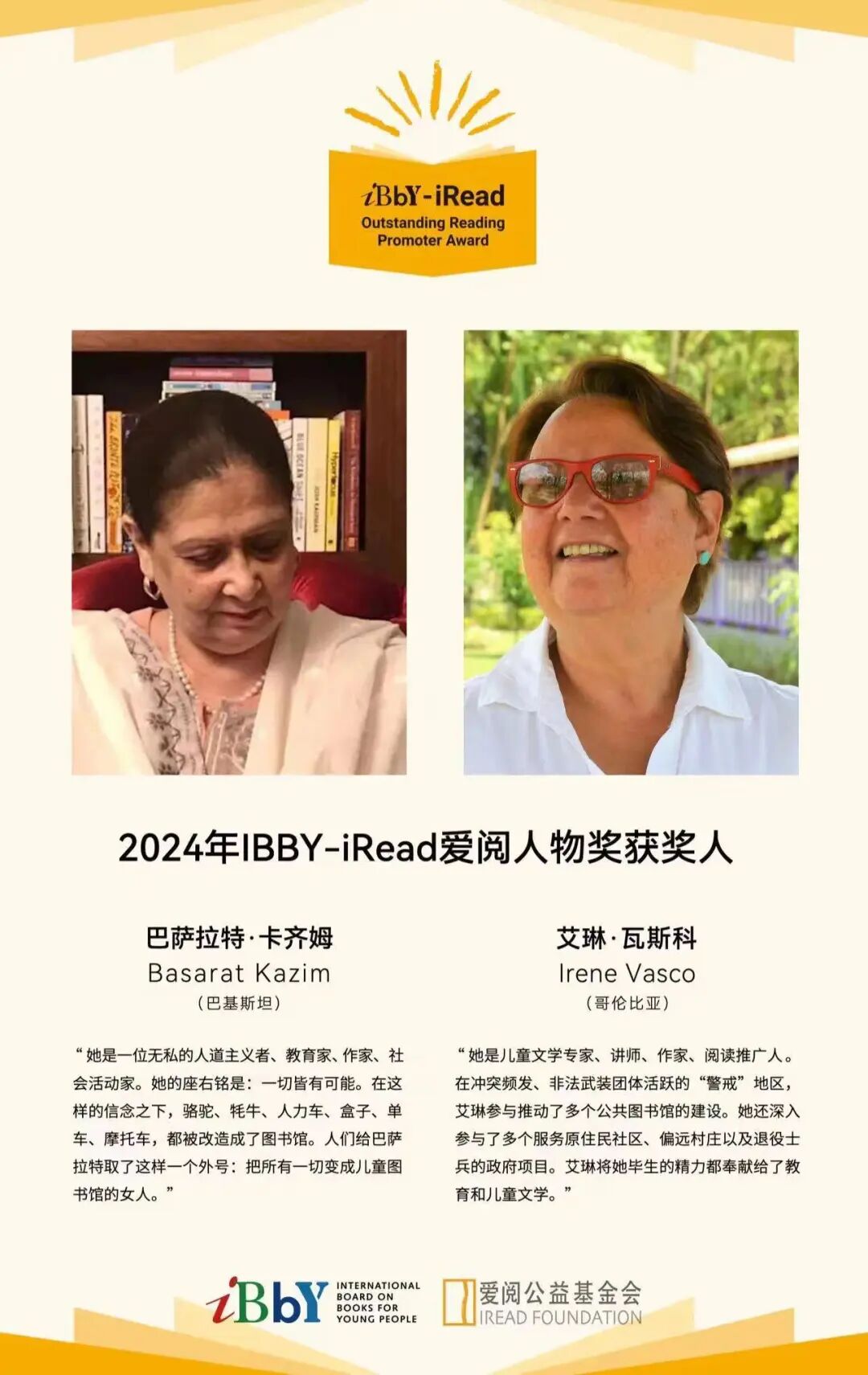 2024年4月8日,国际儿童读物联盟(IBBY)宣布了今年的IBBY-iRead爱阅人物奖获奖人,两位获奖人分别为来自巴基斯坦的巴萨拉特·卡齐姆(Basarat Kazim)和来自哥伦比亚的艾琳·瓦斯科(Irene Vasco)。