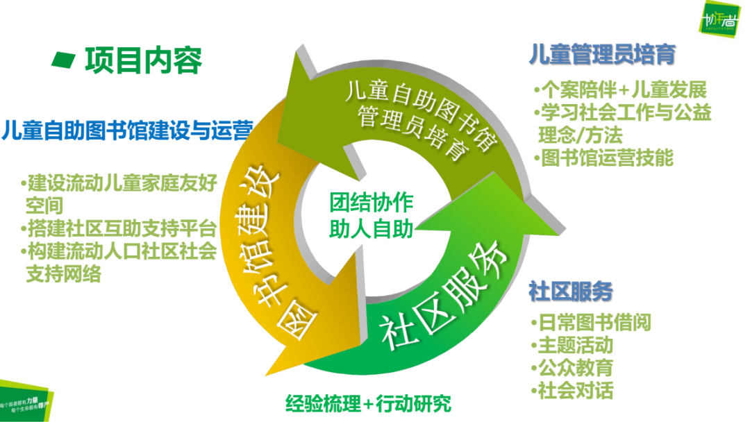 以协作者的“团结协作 助人自助”理念为核心和指导,困境儿童自助图书馆项目分别从“图书馆建设”、“管理员培育”、“社区服务”三方面开展服务,同时也发挥协作者的优势开展经验梳理和行动研究。具体的项目内容如下: